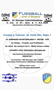 es ist wieder so weit, am Freitag, 06.02.2026 geht es in der Ehninger Sporthalle um den 10. Ehninger SPORTSHELDEN 9 – Meter – Cup.