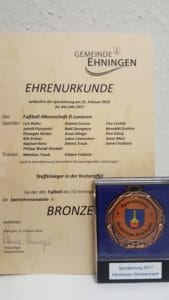 Dass ihre hervorragende sportliche Leistung auch öffentlich anerkannt wird, war sicherlich ein tolles Erlebnis für die Jungs, das zusammen mit der überreichten Ehrenmedaille noch länger in ihrem Gedächtnis haften bleiben wird. Nach dieser Auszeichnung können sie sich jetzt mittwochs wieder dem Fußball widmen, um sich für die nächsten anspruchsvollen sportlichen Aufgaben vorzubereiten.