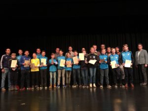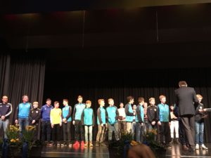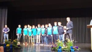 Die Ehrung der Sportler leitet TSV-Präsident Martin Huttenlocher mit einem Grußwort ein, an dessen Ende er allen anwesenden Sportlern in Anlehnung an die olympischen Spiele symbolisch eine Goldmedaille umhängt. Zu Beginn werden die Ehninger Sportler ausgezeichnet, die auf deutscher oder sogar internationaler Ebene erfolgreich waren wie z.B. Spitzenturnerin Kim Bui, die persönlich anwesend ist. Doch dann, direkt im Anschluss an die Handballer ist es soweit. Zusammen mit den „Tennislern“ werden die D1-Junioren zusammen mit ihren beiden Trainern von der ersten Bürgermeisterin Stachon als „Staffelsieger in der Kreisstaffel“ angekündigt und auf die Bühne gebeten. Dort ist die Aufregung, vor der gut besetzten Halle einzeln namentlich aufgerufen zu werden, dann bei einigen der Jungs spürbar. Sichtlich stolz nehmen sie jedoch anschließend die Sportehrenmedaille in Bronze und ihre Ehrenurkunde, zusammen mit den anerkennenden Worten für ihre tolle Leistung, aus den Händen von Bürgermeister Unger in Empfang. Ein gemeinsames Pressefoto auf der Bühne rundet den Abend ab.
