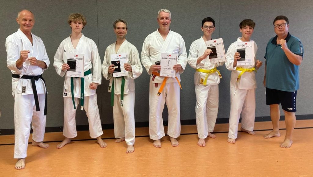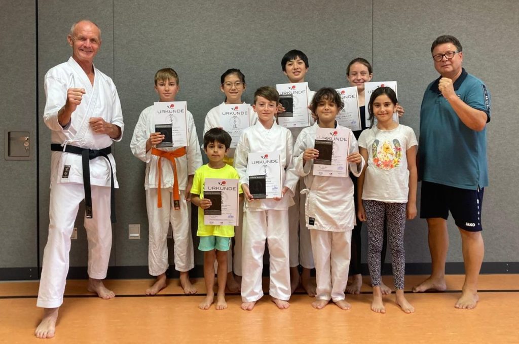 4 Anfänger, 5 Kinder und Jugendliche und 3 Erwachsene stellten sich dem vereinseigenem Prüfer Jochem Hartstang. Alle Prüflinge zeigten respektable Leistungen und konnten ihre deutlichen Vorschritte zur letzten Prüfung nachweisen. Somit bekamen die Anfänger Fabian Burger, Maria Merabet und Tim Deutsch den weisen Gürtel. Obwohl Anfängerin, darf Luisa Reichert nur bereits den gelben Gürtel tragen – zusammen mit Daniel Fey. Den orangen Gürtel bekamen Maja Zhao, Hannes Schneider und Tom Lohmeyer. Sascha Köhler, der bei der Prüfung durch besonders gute Leistungen aufgefallen ist, darf ab sofort zusammen mit Ben Mossmann den grünen Gürtel tragen. Jonas Uhrig und Filip Doczekalski sind jetzt mit blauen Gürten unterwegs.
